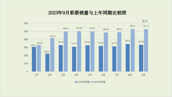 1-9月累计,全国共销售彩票4285.35亿元,同比增加1472.94亿元,增长52.4%。其中,福利彩票机构销售1445.39亿元,同比增加323.07亿元,增长28.8%;体育彩票机构销售2839.96亿元,同比增加1149.87亿元,增长68.0%。